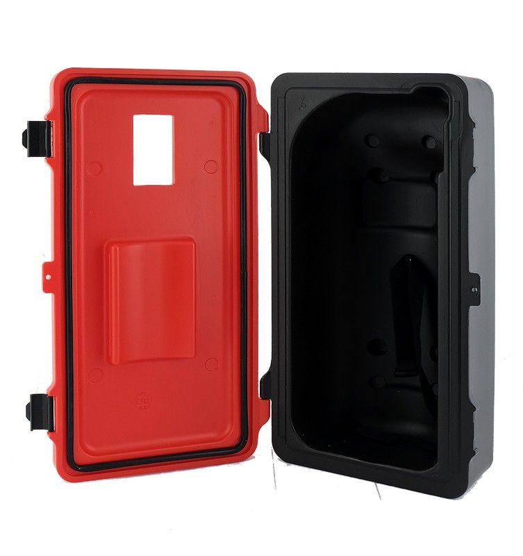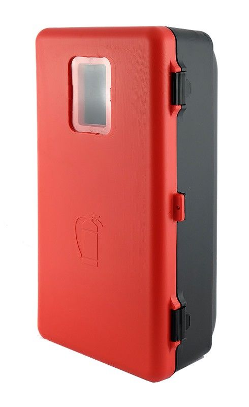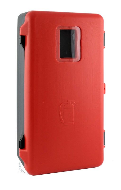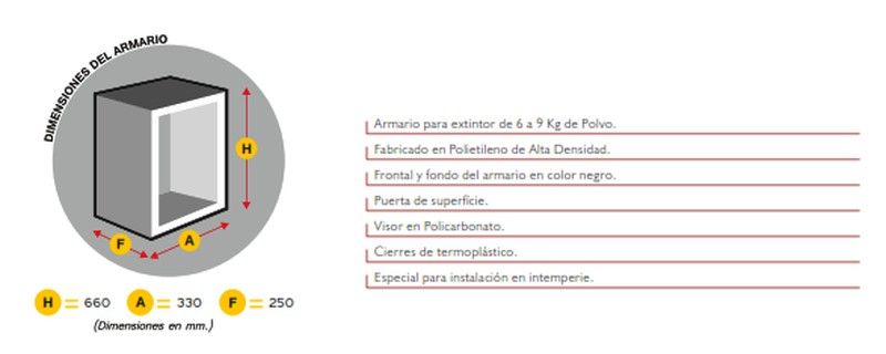 Armoire pour extincteurs de 6 à 9Kg. Poussière Dimensions H=660, L=330, P=250 mm. Fabriqué en polyéthylène. Porte superficielle. Fermetures en plastique. Spécial pour installation extérieure.