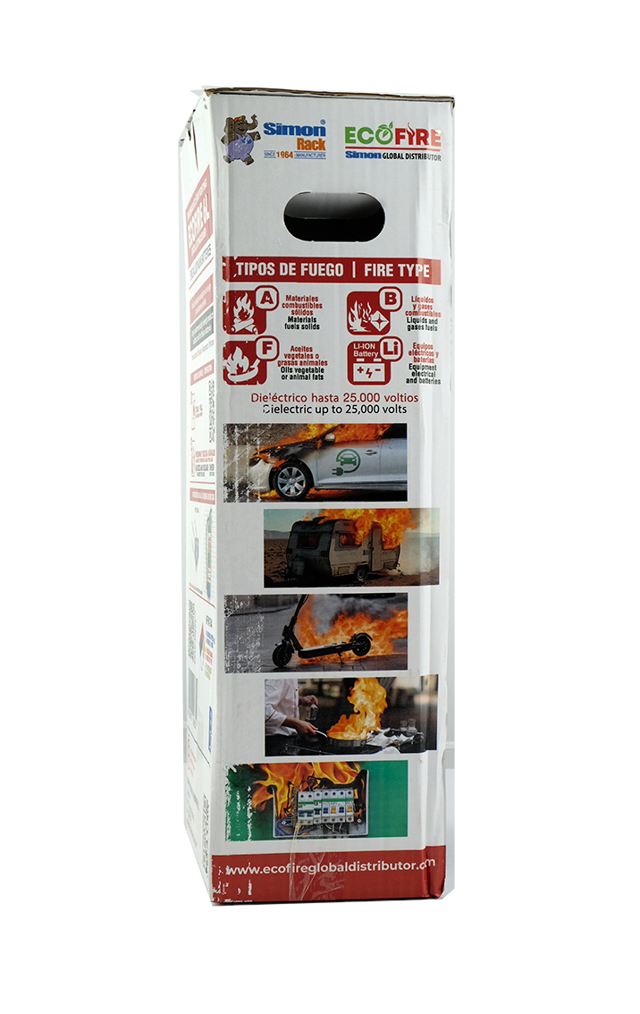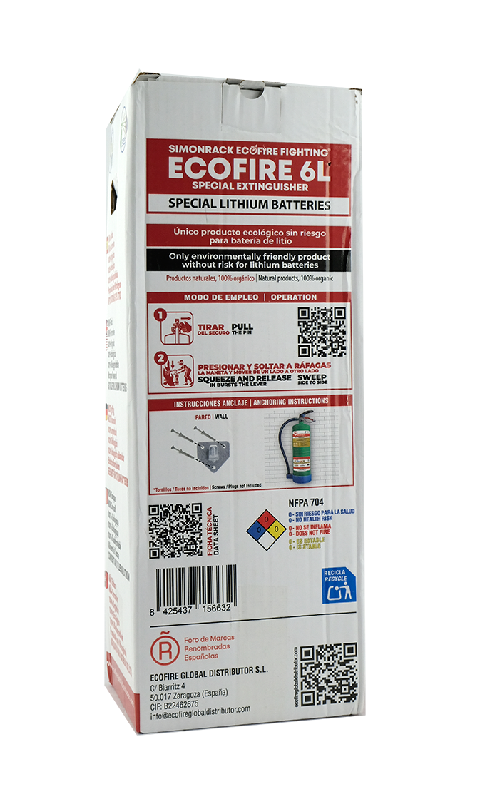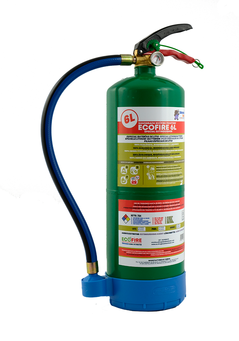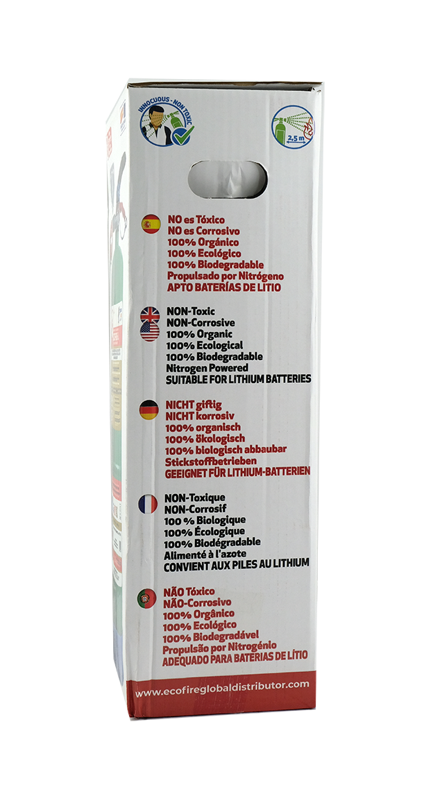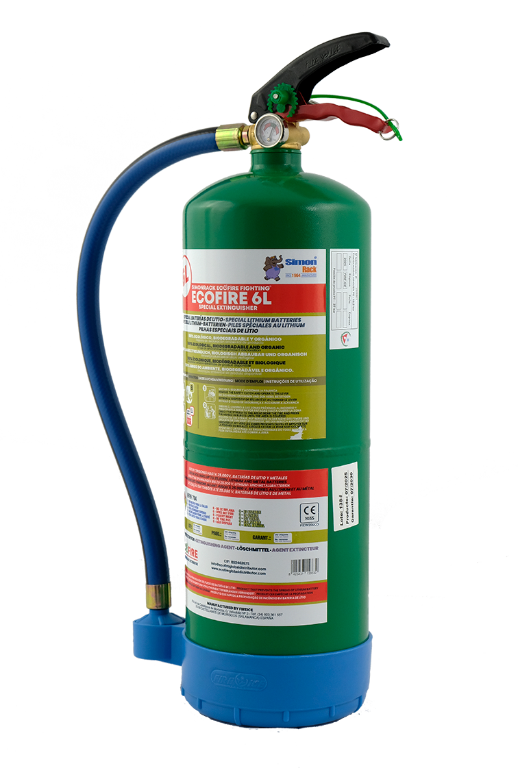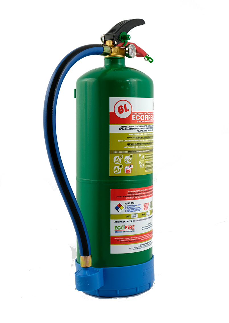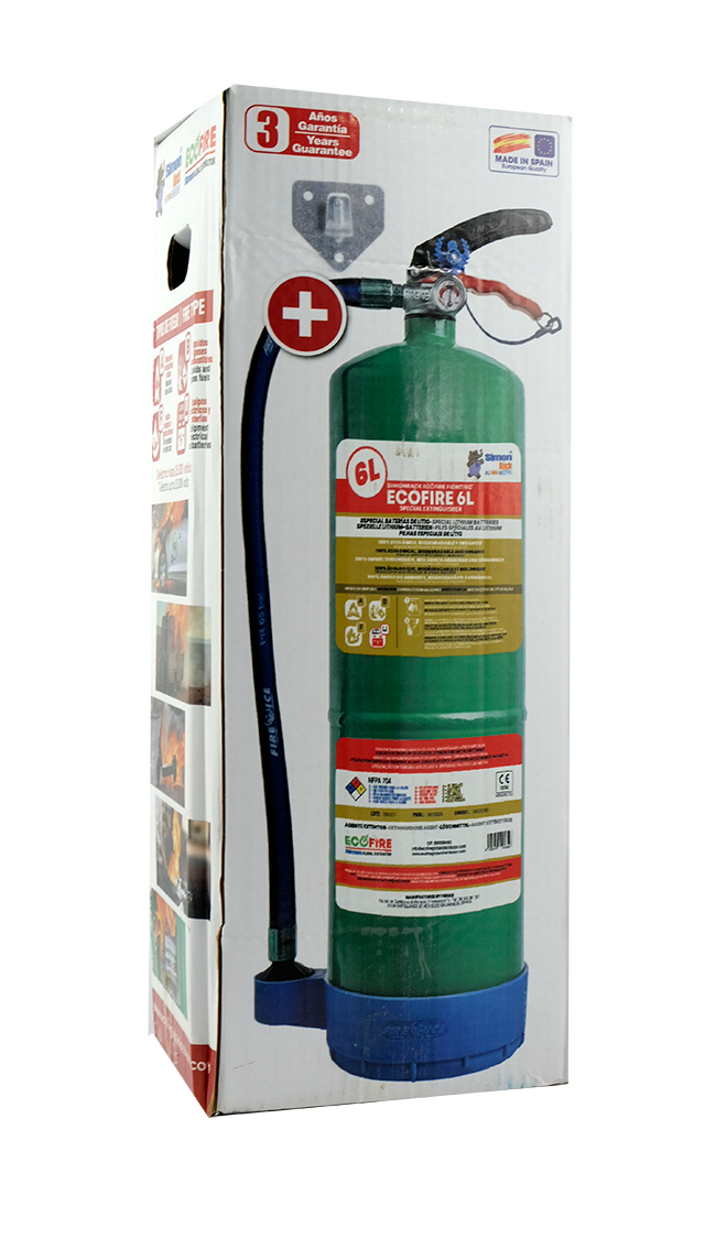 L'extincteur « ECOFIRE » de 6 litres est spécialement conçu pour les batteries électriques ou au lithium (voitures, scooters, chariots élévateurs, etc.) et convient aux feux de classes A, B, F et L. ECOFIRE est un produit 100 % écologique, biodégradable et biologique. Ne vous laissez pas surprendre par un incendie de batterie au lithium. Achetez notre extincteur écologique et assurez-vous une protection adéquate tout en protégeant la planète et tous les êtres vivants. Sécurité et durabilité vont de pair !