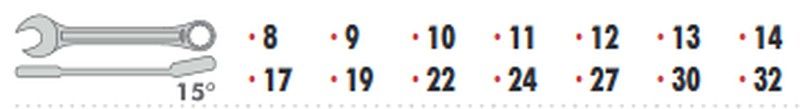 Ensemble de clés combinées dans un sac en nylon avec 14 pièces. Outil professionnel pour les travaux de serrage sur éléments vissés au moyen d'une vis ou d'un écrou, principalement à tête hexagonale.